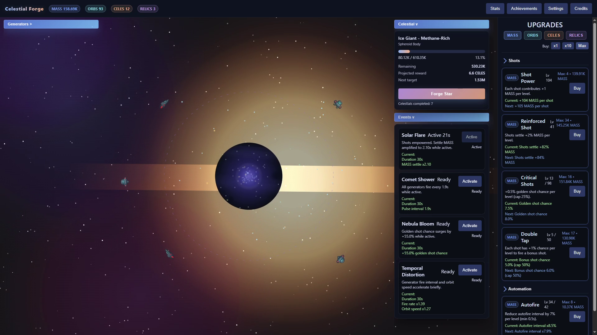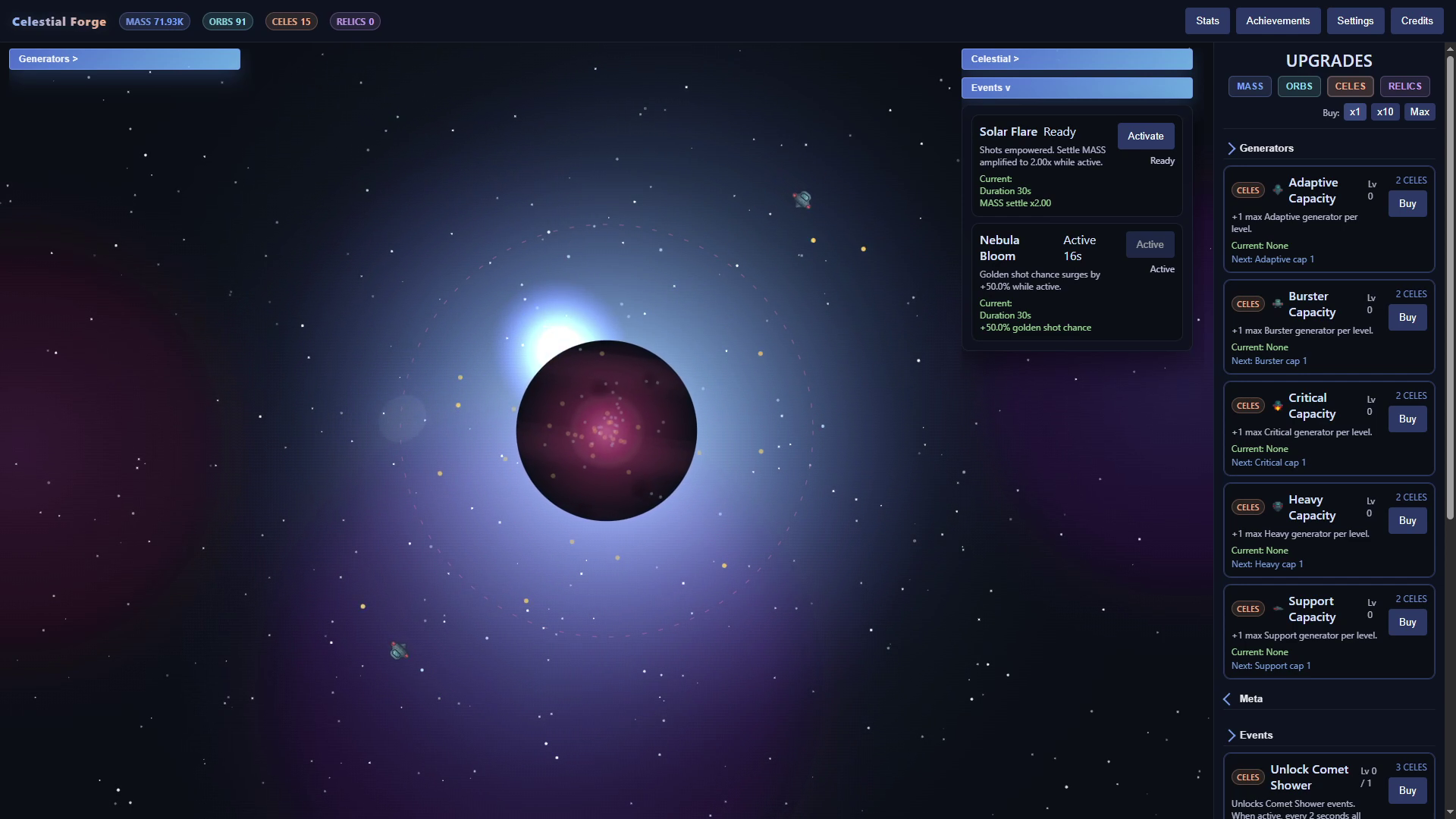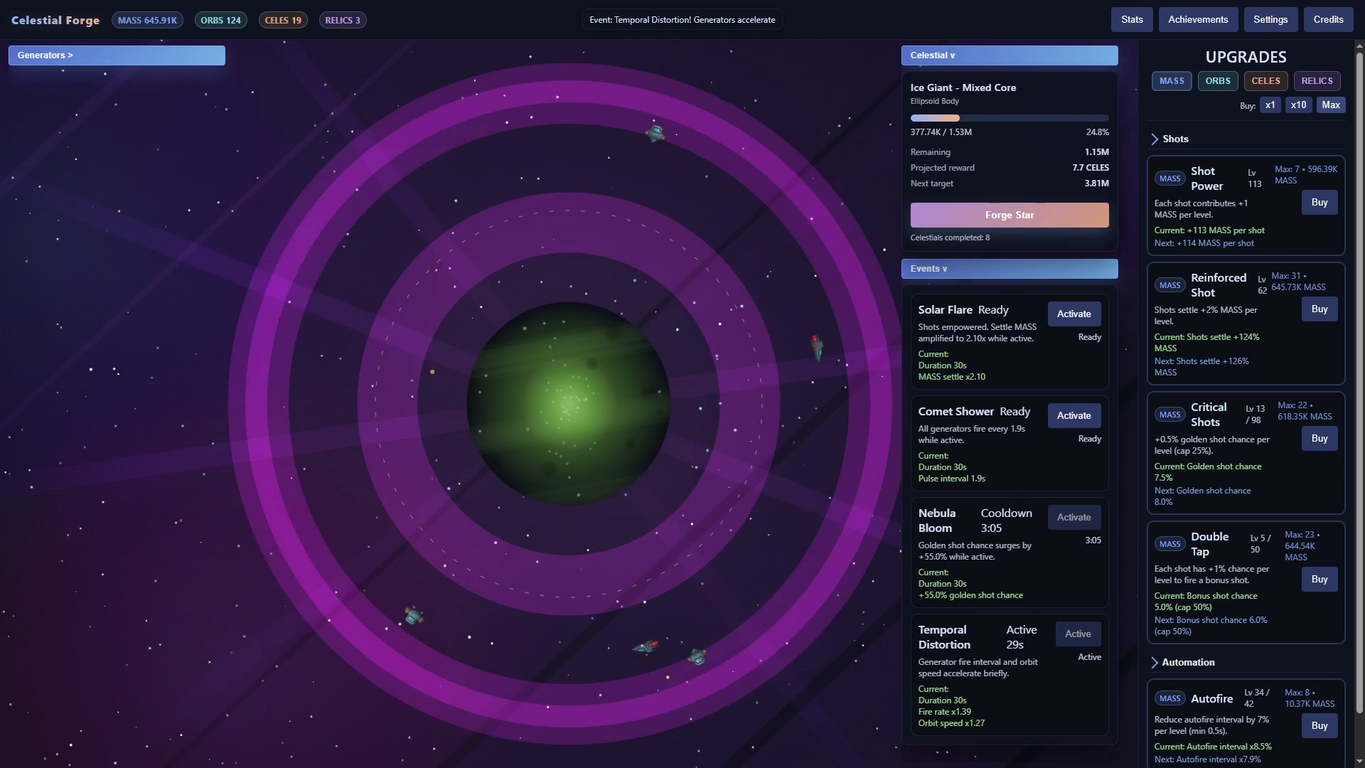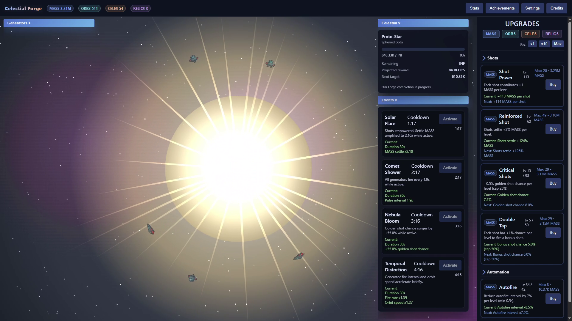 Generators fire balls of mass towards the core, forming a world. Complete celestial bodies, unlock different generator types, discover powerful events, and, once you’re ready, enter the Star Forge to try and forge the largest star while earning the powerful RELICS resource.